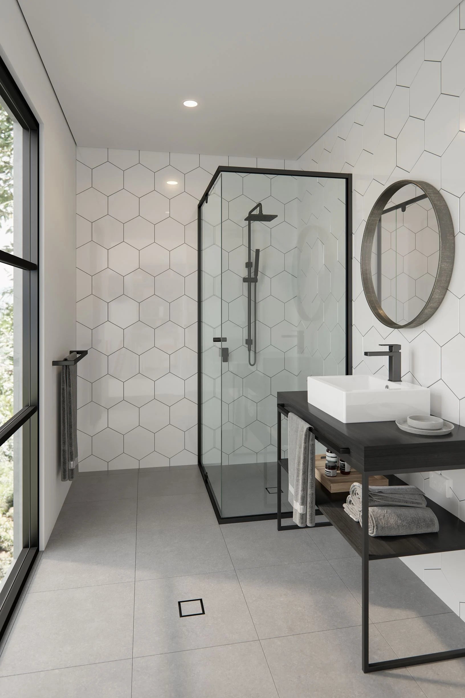 Take your bathroom to another level using unique design elements, such as industrial style vanities, black hardware and metal framework.