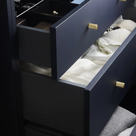 Wanting a sleek hardware free look for your wardrobe? We offer two styles of handleless drawer front options to provide a minimalist and timeless look. Choose from either a finger pull or push-to-open option.